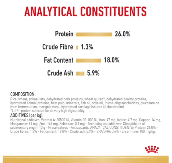Rice, wheat, animal fats, dehydrated pork proteins, wheat gluten*, dehydrated poultry proteins, hydrolysed animal proteins, beet pulp, minerals, fish oil, soya oil, fructo-oligosaccharides, glucosamine (from fermentation), marigold meal, hydrolysed cartilage (source of chondroitin).