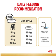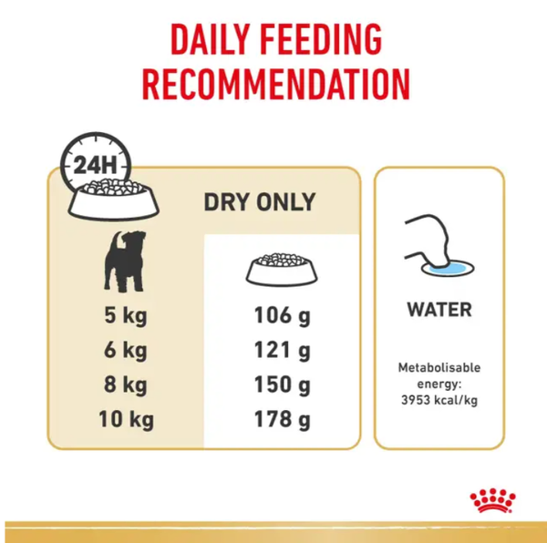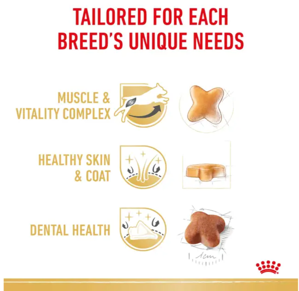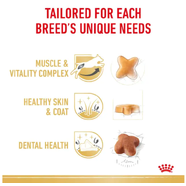 This formula contains an adapted protein content to maintain muscle tone and vitality, along with a synergistic complex of antioxidants, vitamins, and omega fatty acids to help support healthy skin and coat. The exclusive kibble shape is designed to suit the Jack Russell's small, strong jaw, while promoting chewing and oral hygiene.