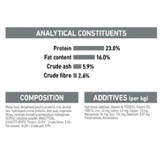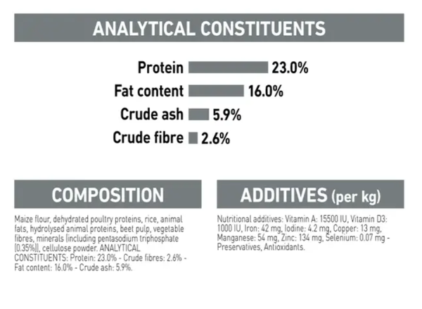 Maize flour, dehydrated poultry proteins, rice, animal fats, hydrolysed animal proteins, beet pulp, vegetable fibres, minerals (including pentasodium triphosphate 0.35%), cellulose powder.