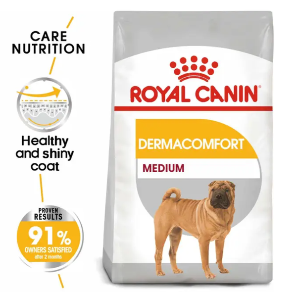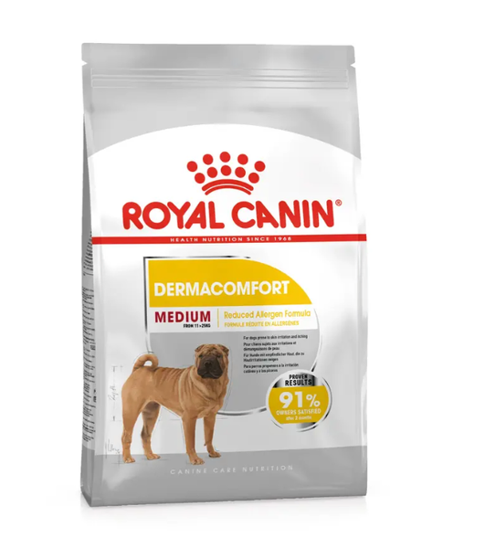 ROYAL CANIN® Medium Dermacomfort is a precisely balanced dry food designed to help protect dogs with sensitive skin from environmental and dietary triggers that may cause itching, irritation, or dry coats.