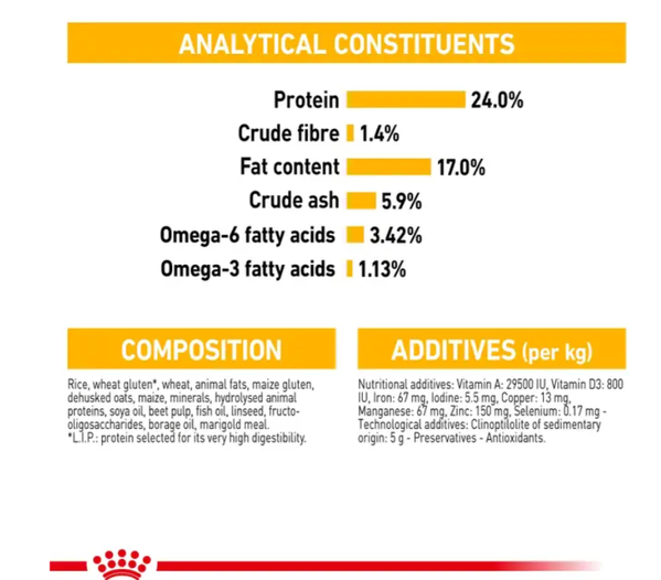 Rice, wheat gluten*, wheat, animal fats, maize gluten, dehusked oats, maize, hydrolysed animal proteins, minerals, soya oil, beet pulp, fish oil, linseed, fructo-oligosaccharides, mono- and diglycerides of palmitic and stearic acids esterified with citric acid, borage oil, marigold extract (source of lutein).