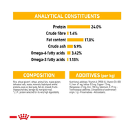 Protein: 25.0% – Fat content: 17.0% – Crude ash: 5.9% – Crude fibre: 1.6%