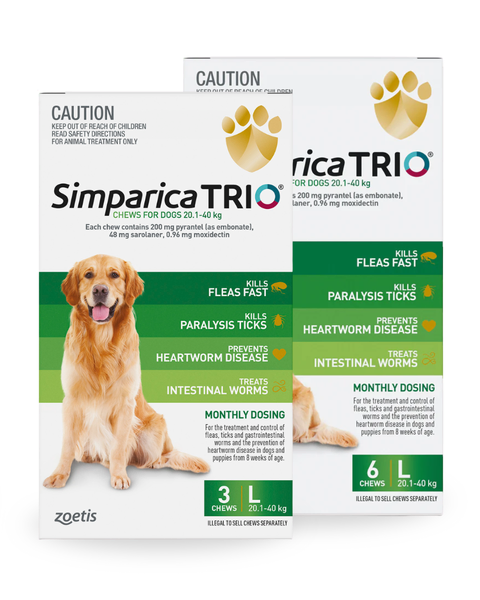 Give your large dog the protection they deserve with Simparica Trio for Large Dogs. Designed for dogs weighing between 20.1–40kg, this powerful once-a-month chew delivers comprehensive protection against fleas, ticks, intestinal worms, mites, and deadly heartworm disease.