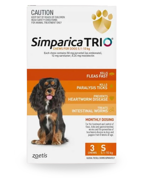 Simparica Trio is a once-a-month chewable tablet that delivers powerful, broad-spectrum protection for dogs against internal and external parasites. With just one tasty chew each month, it prevents deadly heartworm disease, kills fleas and ticks fast, treats and controls gastrointestinal worms, and helps manage mite-related skin conditions like mange.