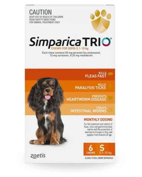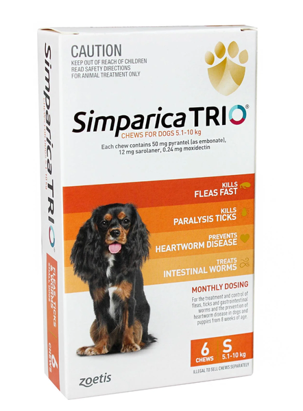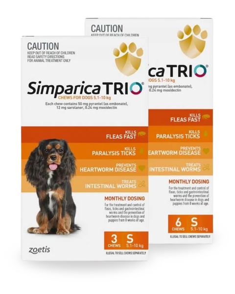 Simparica Trio is a once-a-month chewable tablet that delivers powerful, broad-spectrum protection for dogs against internal and external parasites. With just one tasty chew each month, it prevents deadly heartworm disease, kills fleas and ticks fast, treats and controls gastrointestinal worms, and helps manage mite-related skin conditions like mange.