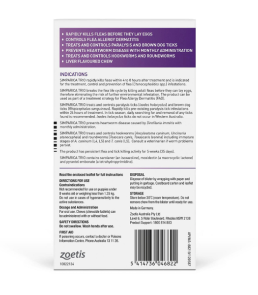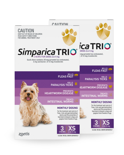 Protect your small dog from a broad range of parasites with Simparica Trio Purple Pack, formulated specifically for dogs weighing 2.6–5.0kg. With just one monthly chew, Simparica Trio delivers triple-action protection against fleas, ticks, heartworm, intestinal worms, and mites, all in a tasty, easy-to-administer chew.