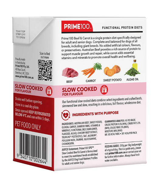 AAFCO Statement: Prime100 SPD Slow Cooked Beef & Carrot is formulated to meet the nutritional levels established by the AAFCO Dog Food Nutrient Profiles for dogs of all ages.
