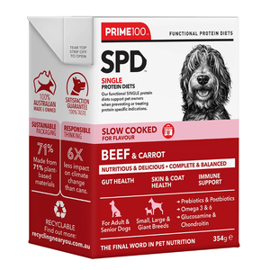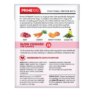 Prime100 Beef & Carrot is a premium single-protein diet meticulously crafted for adult and senior dogs, suitable for all breeds, including giant breeds. This complete and balanced formula features Australian beef, a rich protein source that supports muscle growth and repair, complemented by carrots that deliver essential vitamins and minerals to enhance overall health and well-being.