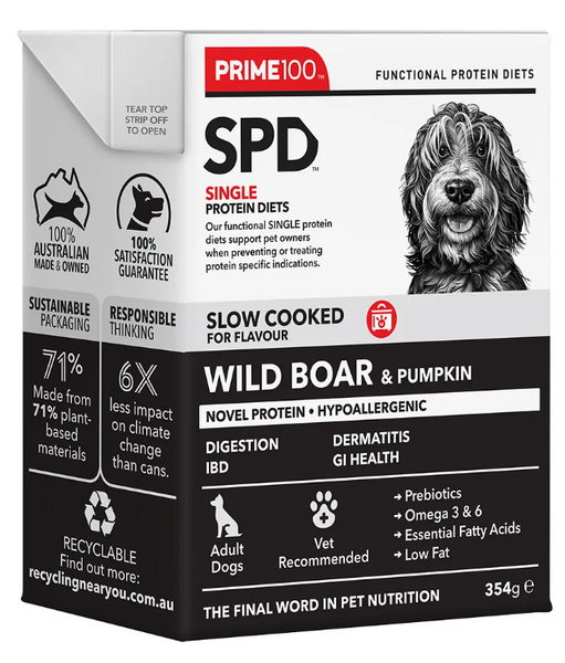 AAFCO Statement: Prime100 SPD Slow Cooked Wild Boar & Pumpkin is formulated to meet the nutritional levels established by the AAFCO Dog Food Nutrient Profiles for adult dogs.