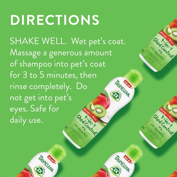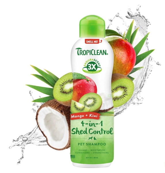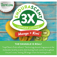 TropiClean EnduraScent Mango Kiwi Shed Control Shampoo is specially formulated to help reduce shedding while leaving your pet smelling fresh for longer. Using innovative EnduraScent™ Technology, the fragrance is distributed evenly throughout the coat, providing a scent that lasts up to three times longer than leading brands.