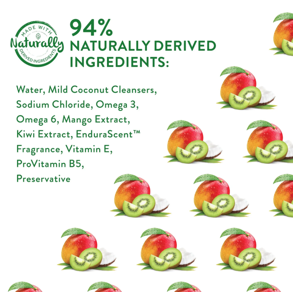 Water, Mild Coconut Cleansers, Sodium Chloride, Omega 3, Omega 6, Mango Extract, Kiwi Extract, EnduraScent™ Fragrance, Vitamin E, ProVitamin B5, Preservative.