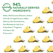 Water, Mild Coconut Cleansers, Sodium Chloride, Pineapple Extract, Alpha Hydroxy, Oat Kernel Extract, Aloe Barbadensis Leaf Juice, EnduraScent™ Fragrance, ProVitamin B5, Preservative.