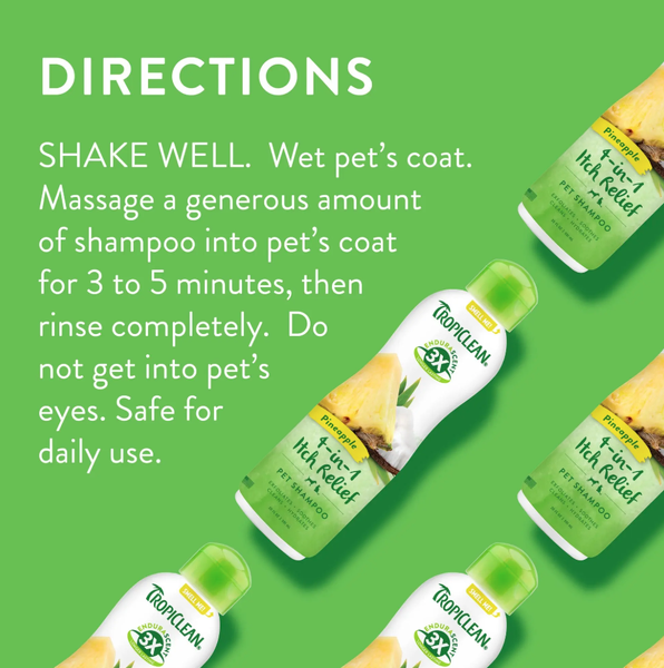 TropiClean EnduraScent Pineapple Itch Relief Shampoo is designed to gently cleanse while helping soothe itchy and irritated skin. Featuring innovative EnduraScent™ technology, the fragrance is distributed evenly throughout your pet’s coat to provide a fresh scent that lasts up to three times longer than leading brands.