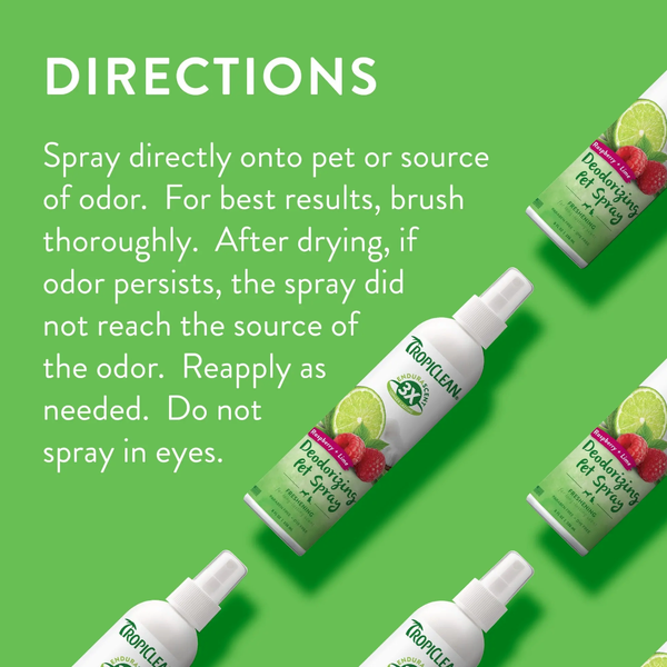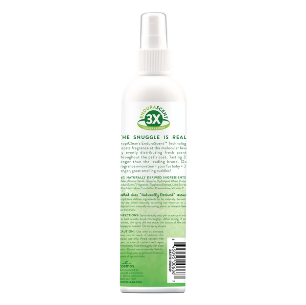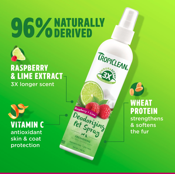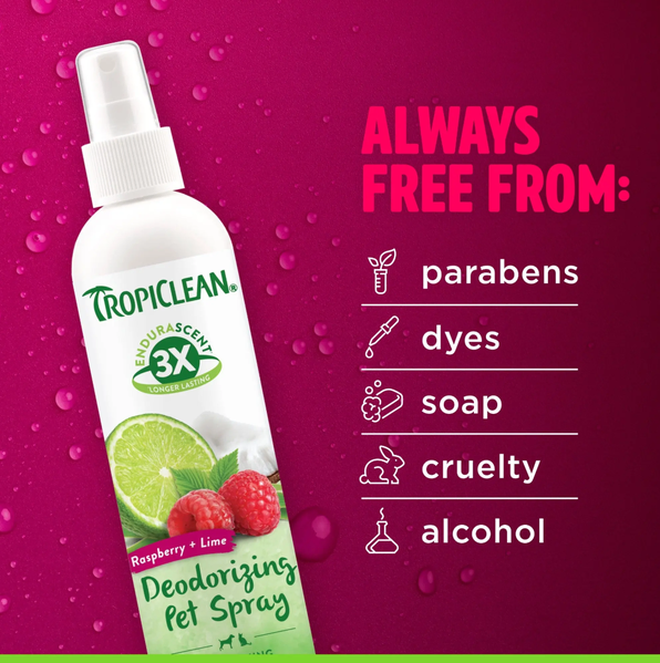 TropiClean EnduraScent Raspberry Lime Deodorizing Spray helps keep your pet’s coat fresh and smelling great between baths. Featuring innovative EnduraScent™ technology, fragrance is distributed evenly throughout the coat to provide a scent that lasts up to three times longer than leading brands.