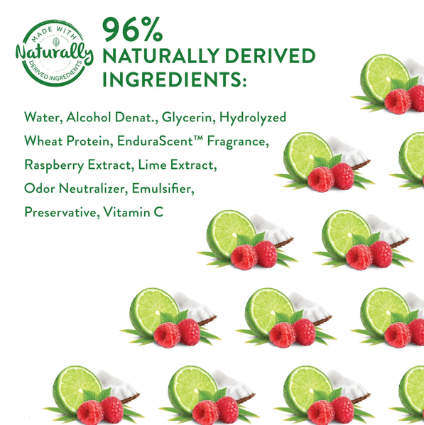 Water, Alcohol Denat., Glycerin, Hydrolyzed Wheat Protein, EnduraScent™ Fragrance, Raspberry Extract, Lime Extract, Odor Neutraliser, Emulsifier, Preservative, Vitamin C.