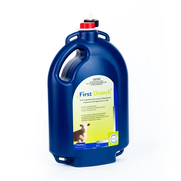 Virbac First Drench for Lambs is a broad spectrum oral anthelmintic designed for the treatment and control of levamisole-susceptible roundworms, lungworms, and tapeworms in lambs. It is particularly valuable for concurrent control of roundworms and tapeworms, including benzimidazole-resistant strains.