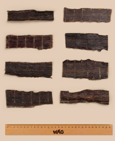 Each jerky strip measures approximately 10–15cm in length and weighs 15–25g. Perfect for use as a training reward, occasional treat, or high-value chew.