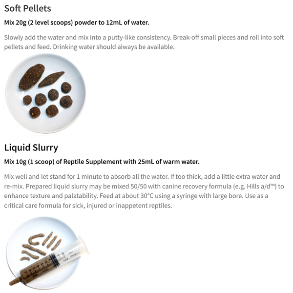 Gradually add water to form a firm paste. Roll into small pellets and feed. Ensure fresh water is always available.